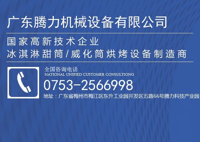 广东腾力机械设备有限公司,成立于2007年,是一家国家高新技术企业及广东省科技型中小企业。 公司成立以来始终专注于全自动冰淇淋甜简烘烤设备和威化烘烤设备的研发、生产、销售和服务,坚持以专业化、定制化、智能化为企业的核心发展战略,成为享誉甜筒行业的专业冰淇淋甜筒烘烤设备的设计、生产和服务商。 到目前为止公司生产的甜筒烘烤设备…